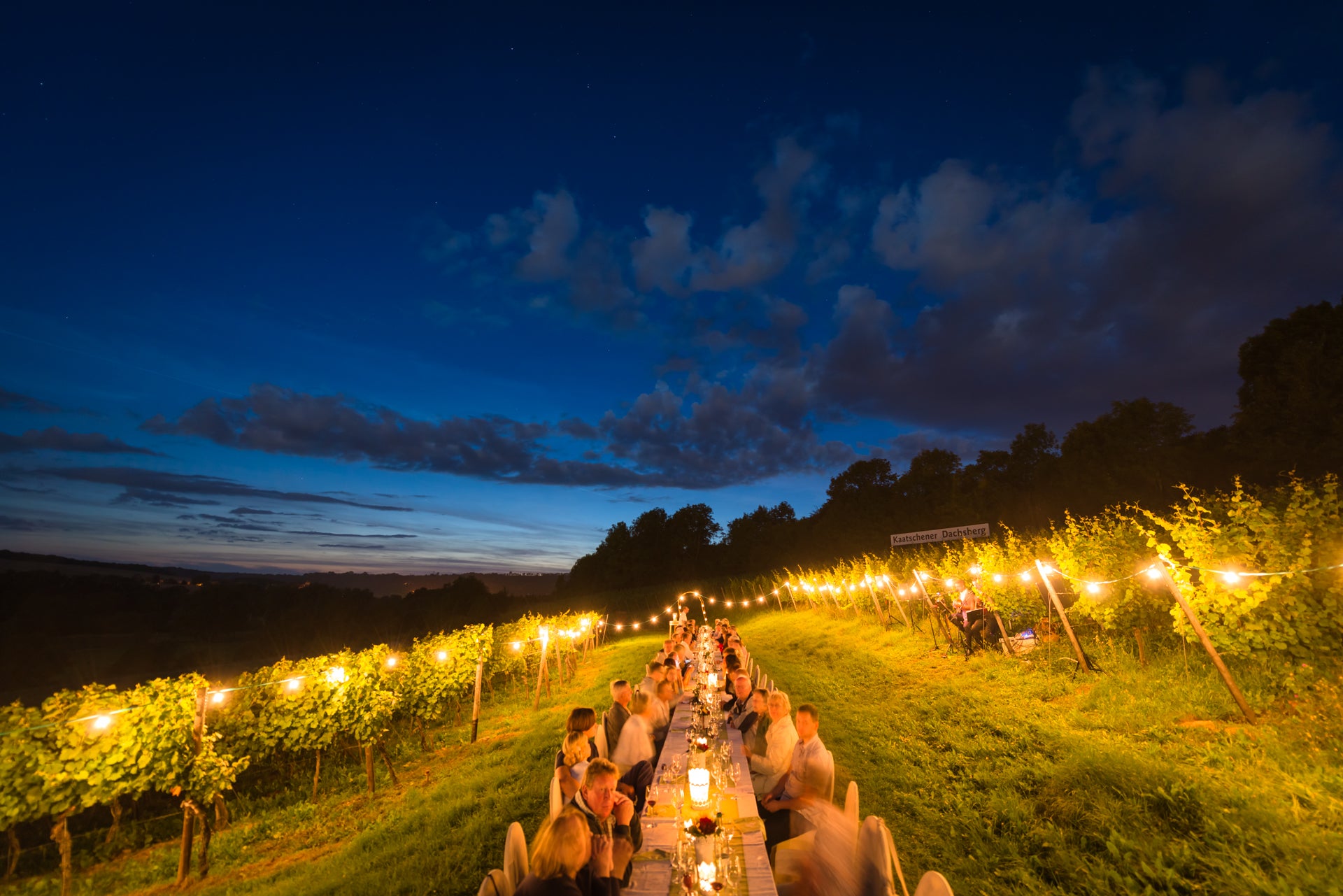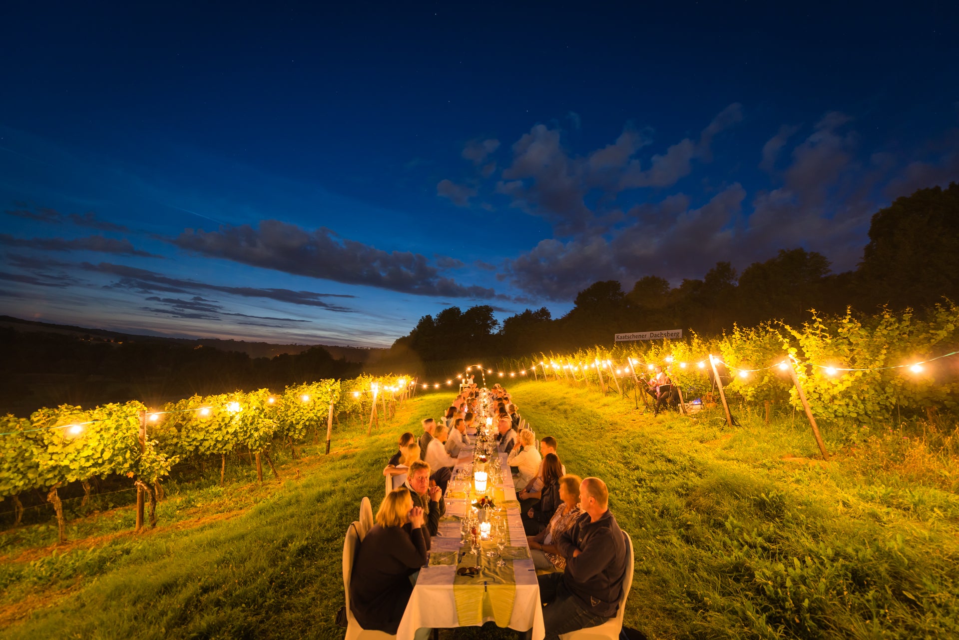 Exklusives Sommerevent mit Sektempfang, 5-Gänge-Menü mit Weinbegleitung, Live-Musik – und Sonnenuntergang mitten im Weinberg