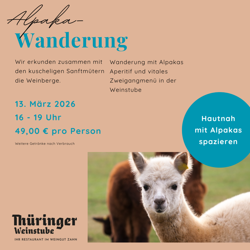 Raus an die frische Luft, rein ins Wohlfühlprogramm: Erlebt eine besondere Alpaka-Wanderung rund um den Weinort Kaatschen – gemeinsam mit den kuscheligen Sanftmütern vom Tierpark Bad Kösen.